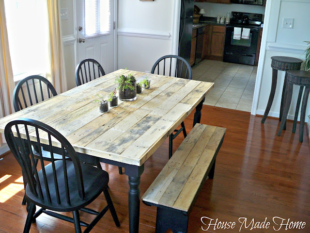 12. HMH Designs created the look of a farmhouse dining table pretty easily by covering their existing table and bench with some pallet wood. Love it!